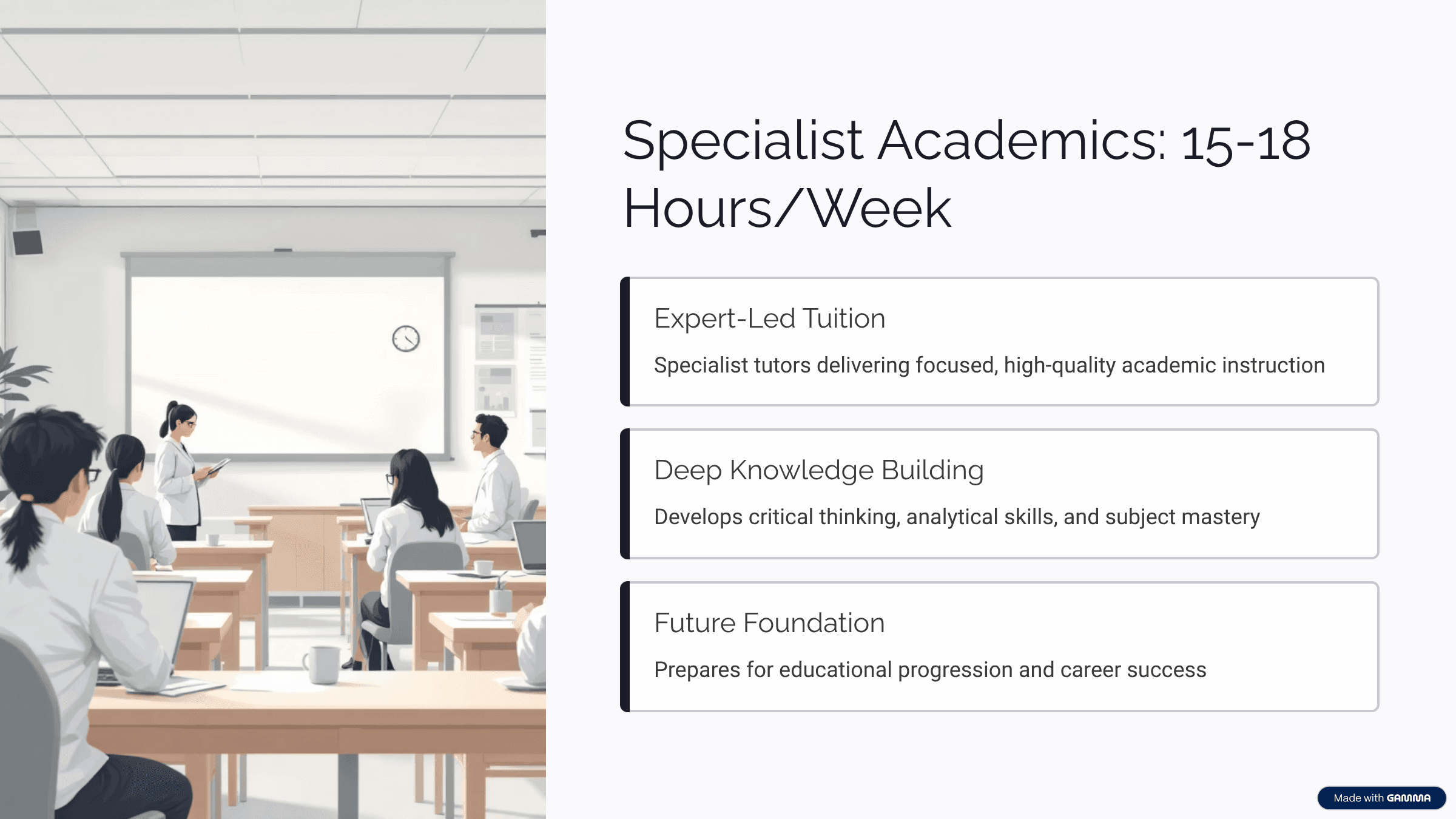 Quality is our priority. Core academic sessions are led by experienced teachers, supported by local scholars for character building. By working with independent tutors for afternoon sessions, we ensure a diverse, high-standard learning experience that fits within a modular, flexible day.